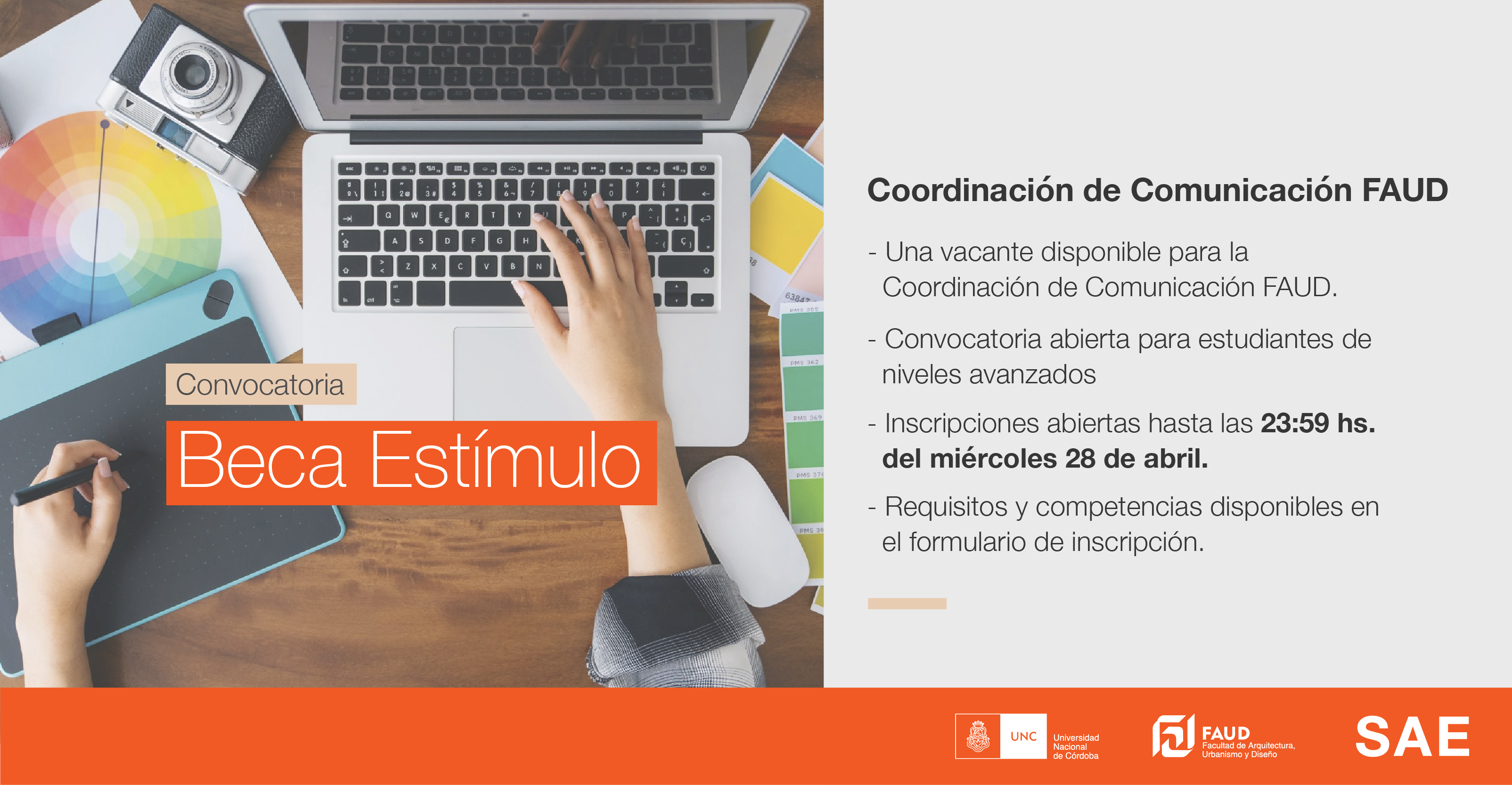 La Secretaría de Asuntos Estudiantiles informa que se encuentra abierta la convocatoria para cubrir una Beca Estímulo en la Coordinación de Comunicación FAUD.