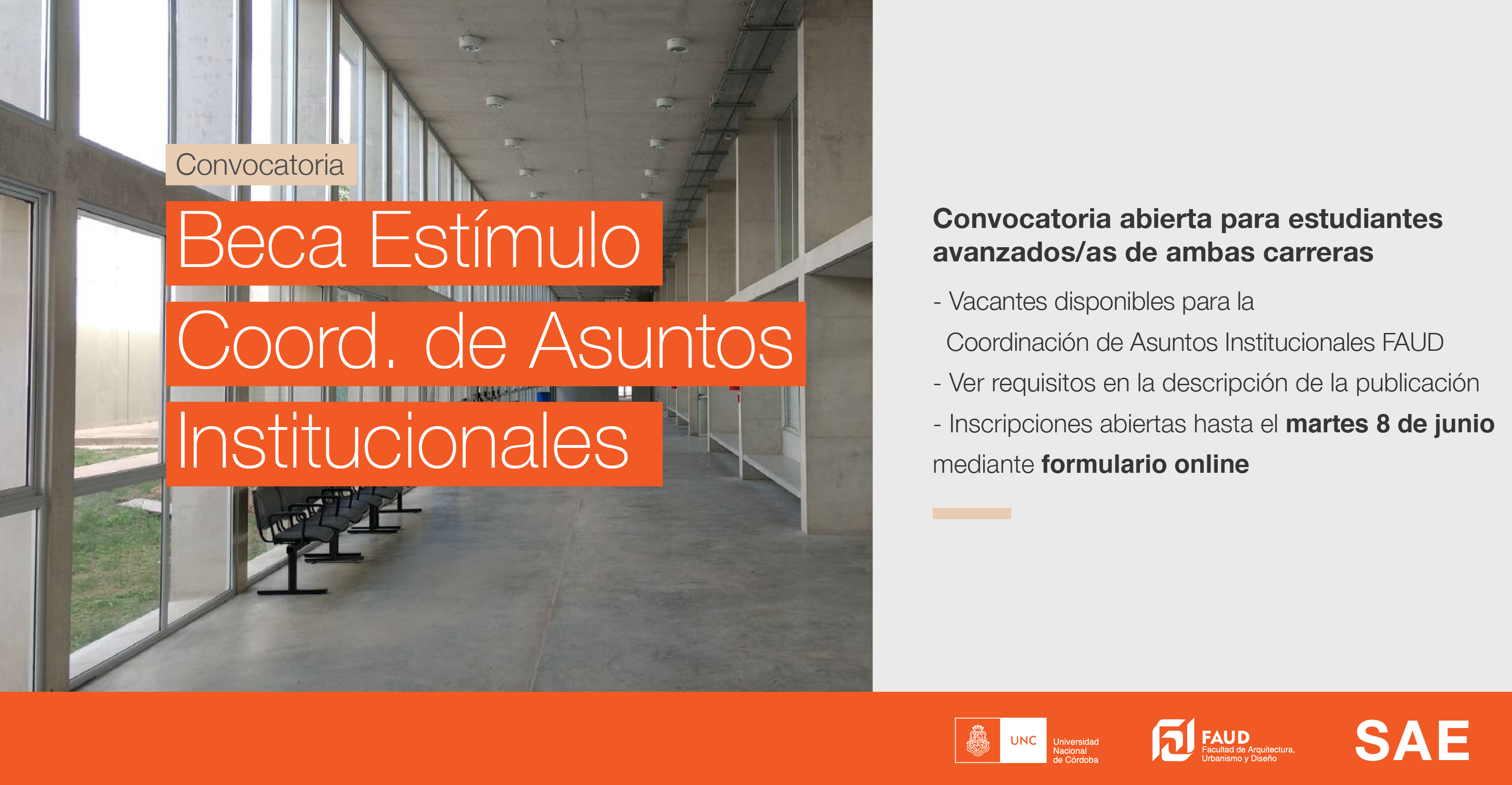 La Secretaría de Asuntos Estudiantiles informa que se encuentra abierta la convocatoria para cubrir una Beca Estímulo en la Coordinación de Asuntos Institucionales FAUD.