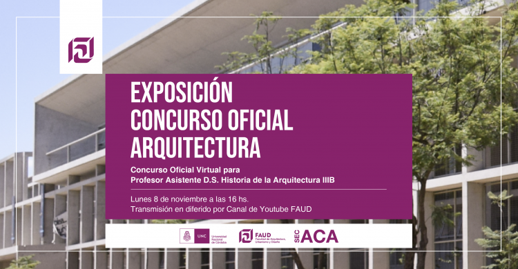 Secretaría Académica informa que el día lunes 8 de noviembre a las 15 hs. se transmitirá en diferido la exposición correspondiente al Concurso Oficial Virtual para Profesor Asistente, Dedicación Simple de la cátedra Historia de la Arquitectura III B.