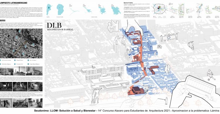 "Ubicado en barrio Alberdi, uno de los seis barrios pueblos que rodean a la ciudad de Córdoba, el proyecto se materializa mediante una propuesta de sistema de arquitectura, donde permite realizar intervenciones disgregadas a lo largo de un área específica, Identificando sitios de intervención puntuales y generando un recorrido y equipamiento urbano, pasible de ocuparse con disimiles programas. Opta por deconstruir la idea de solución única para aportar un sinnúmero de posibilidades de aplicación, incorporándose naturalmente a la ciudad y generando un concepto de salud urbana y social. Es un proyecto ligero y contundente, desde su idea gestora hasta su desarrollo técnico. Busca y encuentra una escala pertinente y sostenible. El uso del acero se encuentra acertado, mesurado y eficiente".