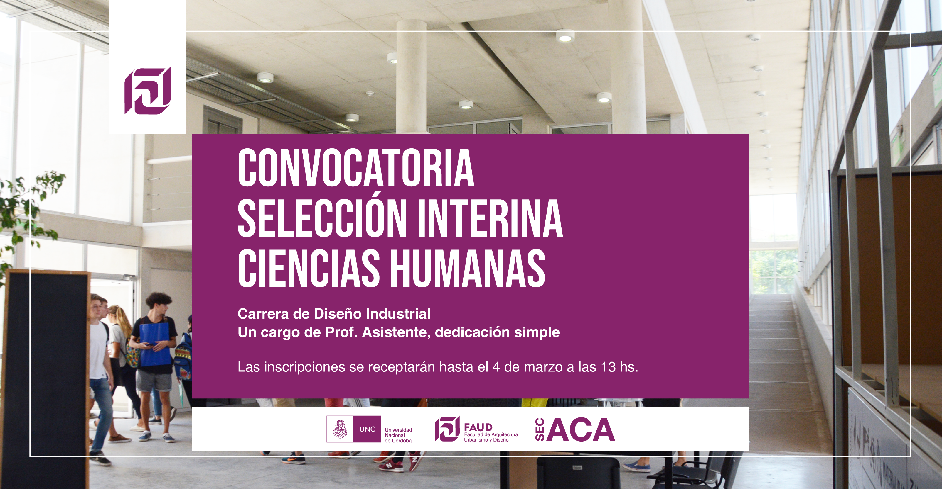 Secretaría Académica informa que se encuentra abierto el llamado de Selección Interina abierta para la cátedra CIENCIAS HUMANAS de la carrera de Diseño Industrial.