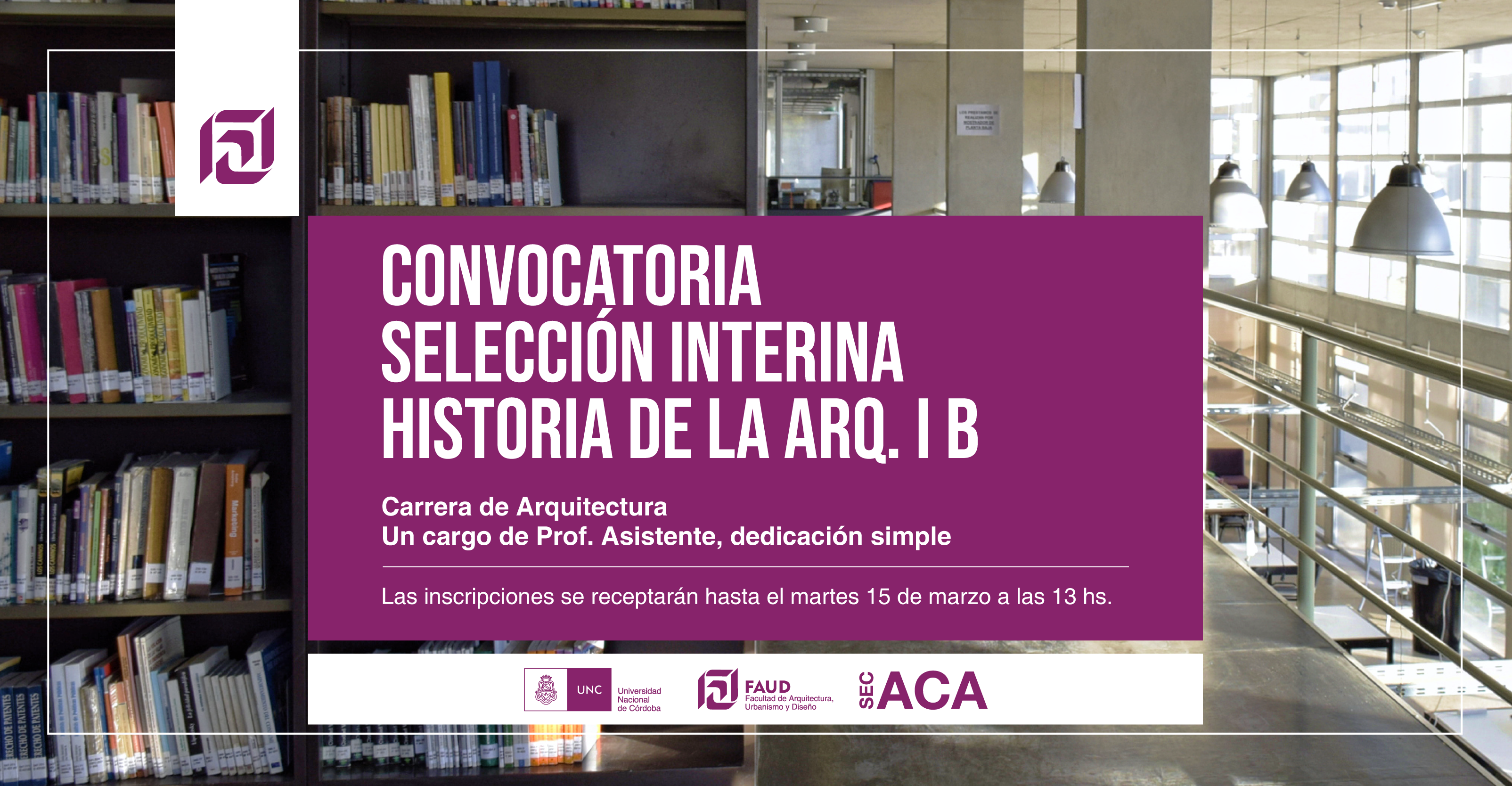 Secretaría Académica informa que se encuentra abierto el siguiente llamado de Selección Interina abierta para la cátedra HISTORIA DE LA ARQUITECTURA I B:
