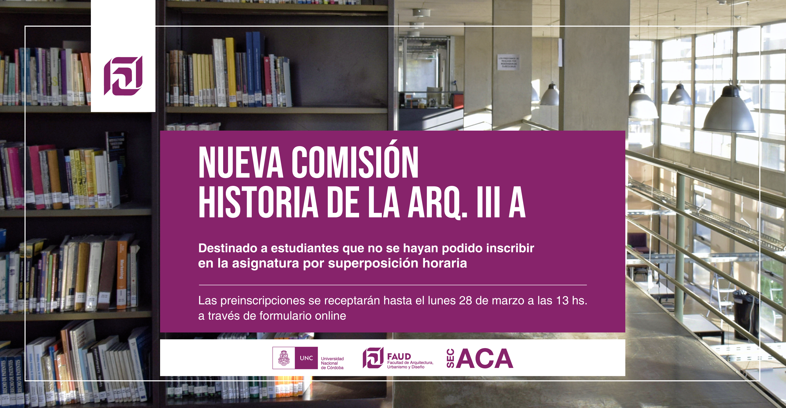 Secretaría Académica informa que se habilitará una nueva comisión de la cátedra Historia de la Arquitectura III A, sólo para quienes no se hayan podido inscribir oportunamente en la asignatura por superposición horaria