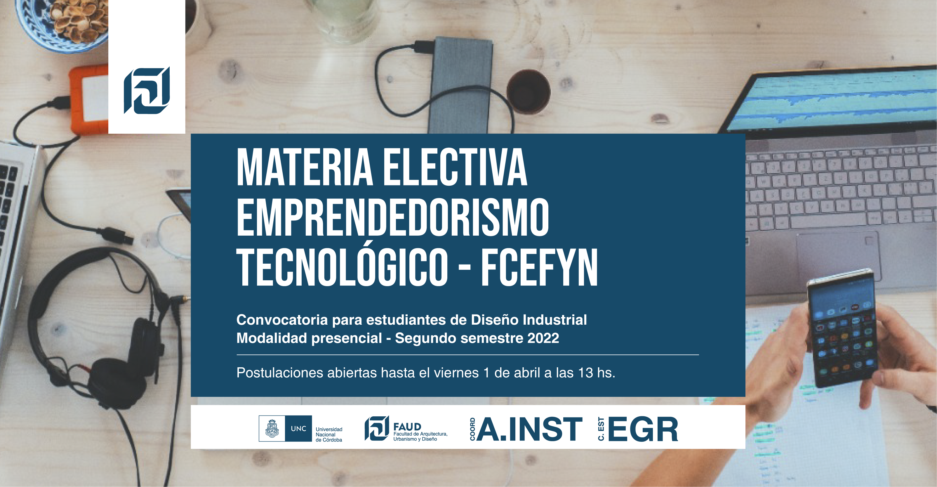 La Coordinación de Asuntos Institucionales informa que se encuentra abierta la convocatoria a estudiantes de Diseño Industrial para cursar la materia electiva Emprendedorismo Tecnológico en la FCEFyN de UNC.