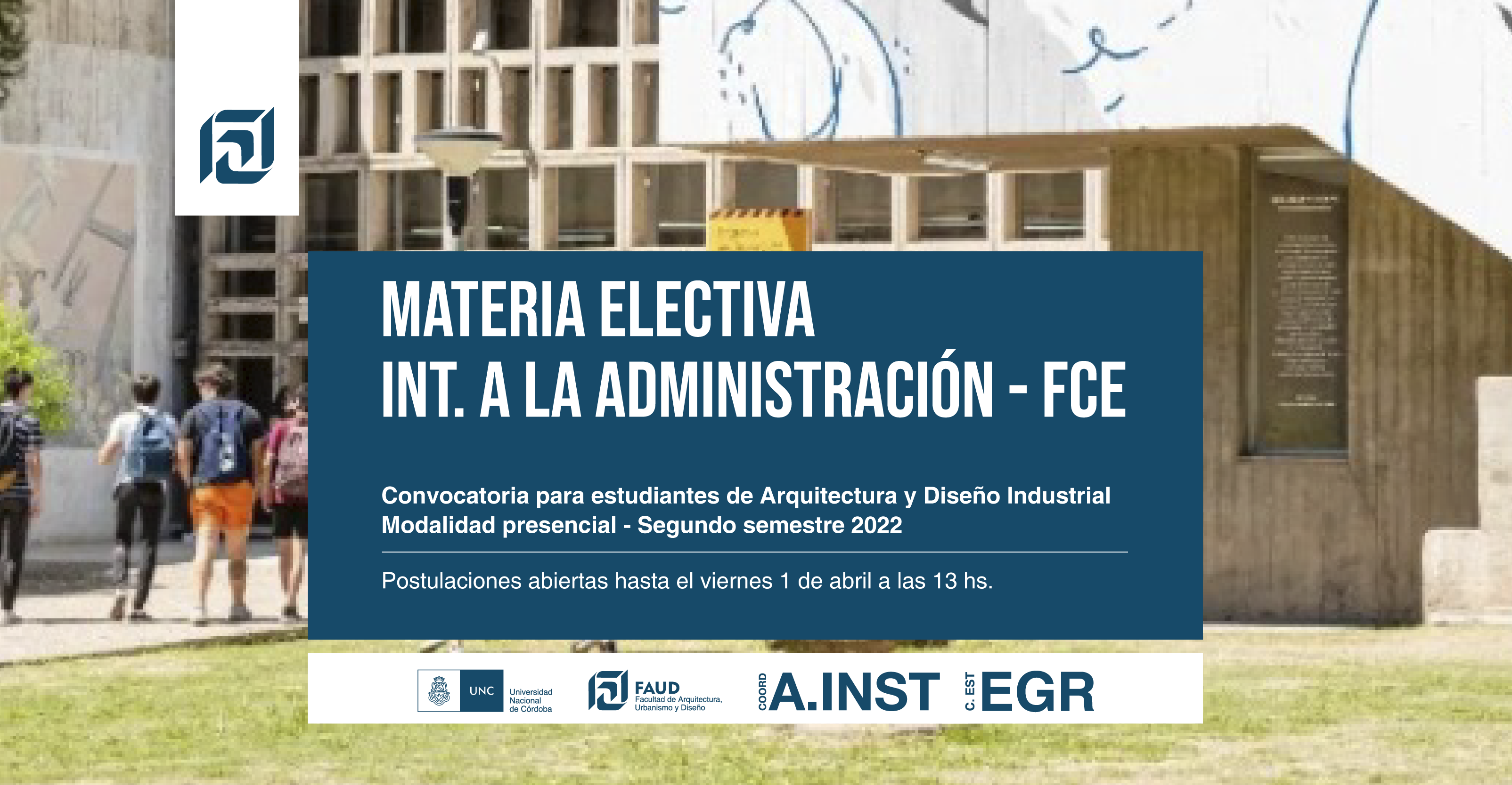 La Coordinación de Asuntos Institucionales informa que se encuentra abierta la convocatoria a estudiantes de Arquitectura y Diseño Industrial para cursar la materia electiva Introducción a la administración en la FCE de UNC.