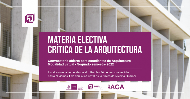 Secretaría Académica informa que durante el segundo semestre se dictará en modalidad virtual la materia electiva Crítica de la Arquitectura.