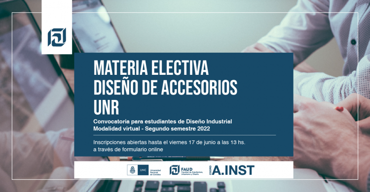 La Coordinación de Asuntos Institucionales informa que se encuentra abierta la convocatoria a estudiantes de Diseño Industrial para cursar la materia electiva "Diseño de accesorios" en la Facultad de Arquitectura, Planeamiento y Diseño de la Universidad Nacional de Rosario.