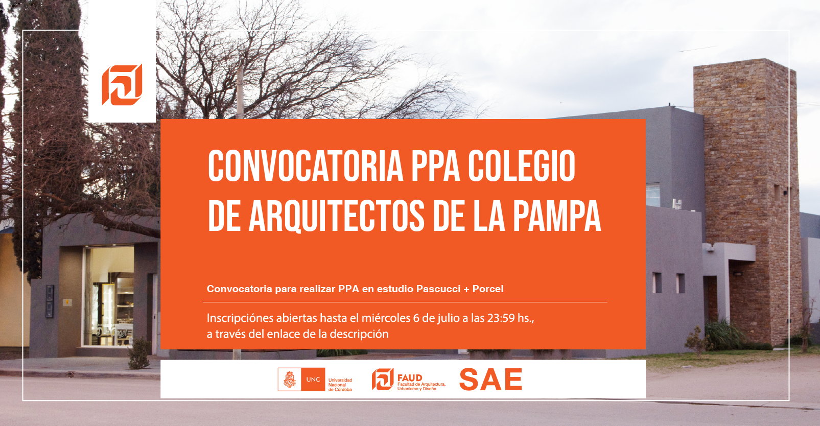 La Secretaría de Asuntos Estudiantiles informa que se encuentra abierta la convocatoria para realizar la Práctica Profesional Asistida en estudio Pascucci + Porcel, en el marco del convenio entre la FAUD y el Colegio de Arquitectos de La Pampa.