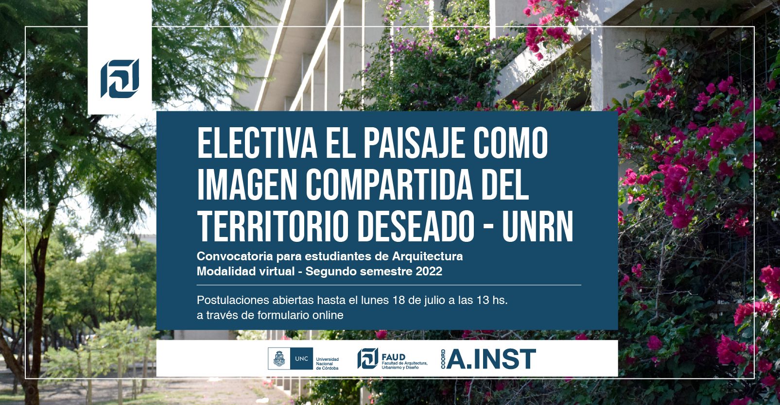 La Coordinación de Asuntos Institucionales informa que se encuentra abierta la convocatoria a estudiantes de Arquitectura para cursar la materia electiva "El paisaje como imagen compartida de territorio deseado" en la Universidad Nacional de Rio Negro.