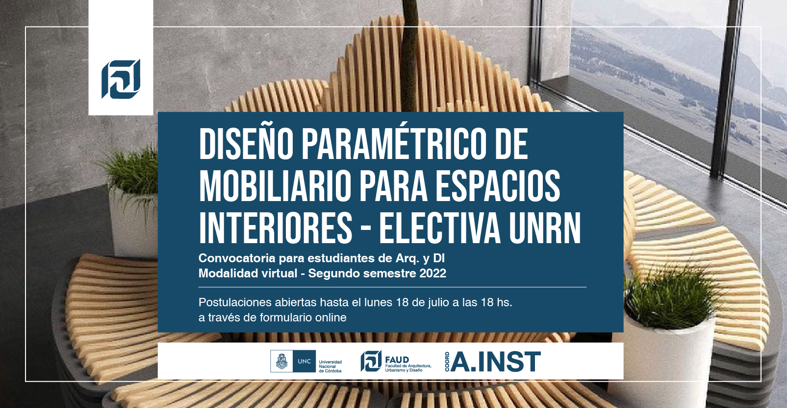 La Coordinación de Asuntos Institucionales informa que se encuentra abierta la convocatoria a estudiantes de Arquitectura y Diseño Industrial para cursar la materia electiva "Diseño paramétrico de mobiliario para espacios interiores" en la Universidad Nacional de Río Negro.