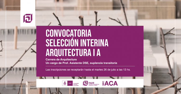 Secretaría Académica informa que se encuentra abierto el llamado a selección interina para el cargo de Prof. Asistente dedicación semiexclusiva para la cátedra de Arquitectura I A, suplencia transitoria.