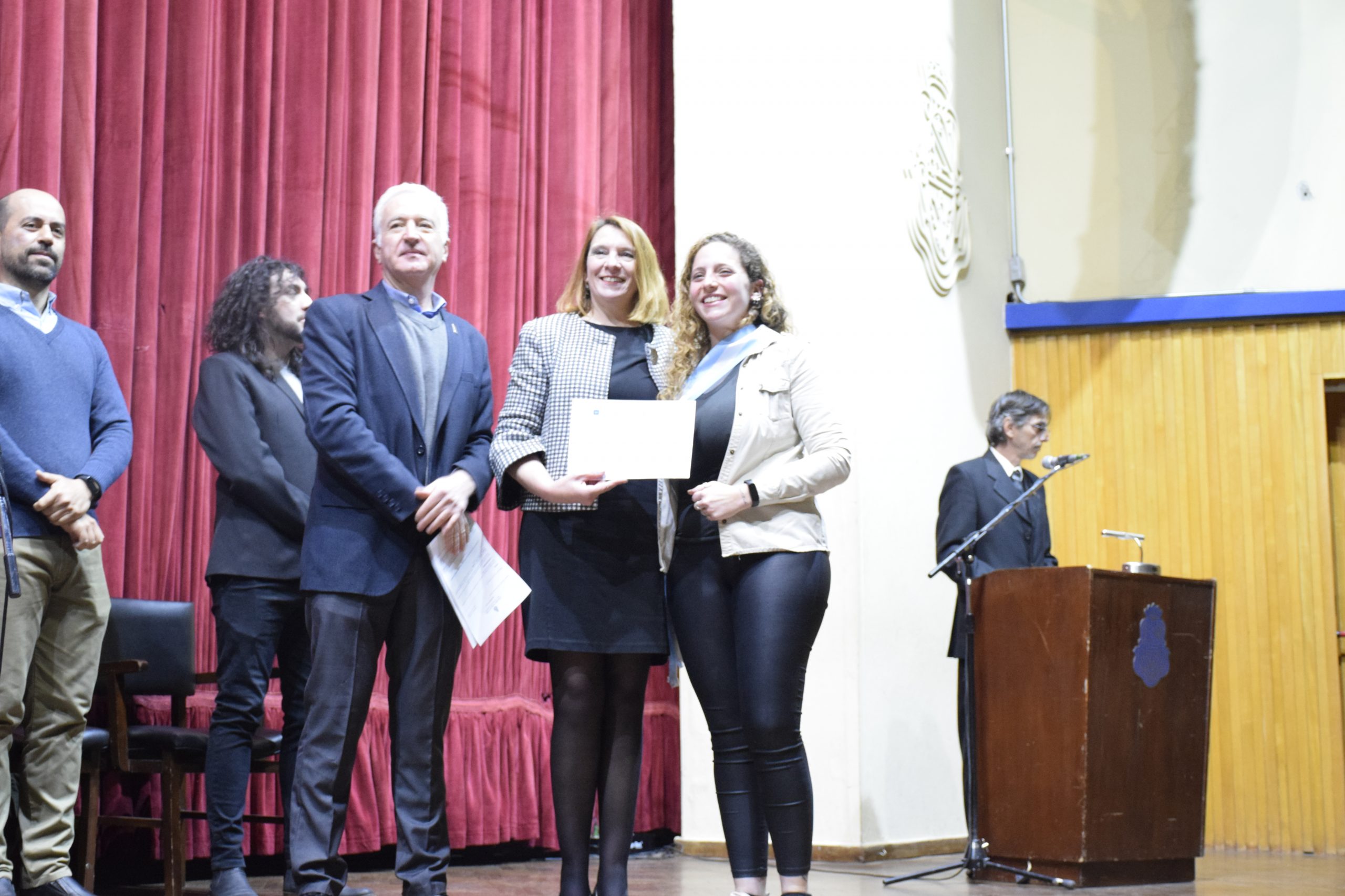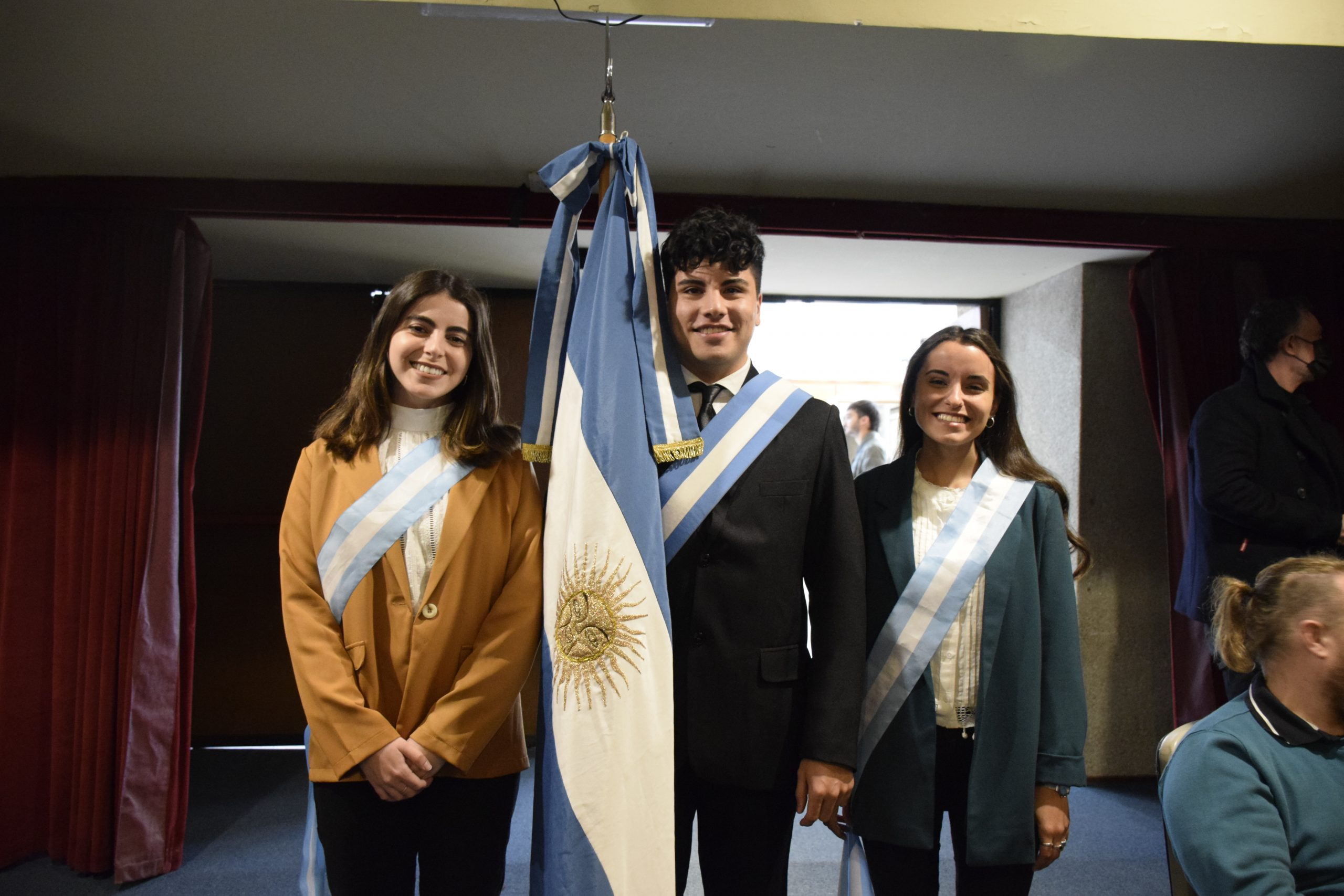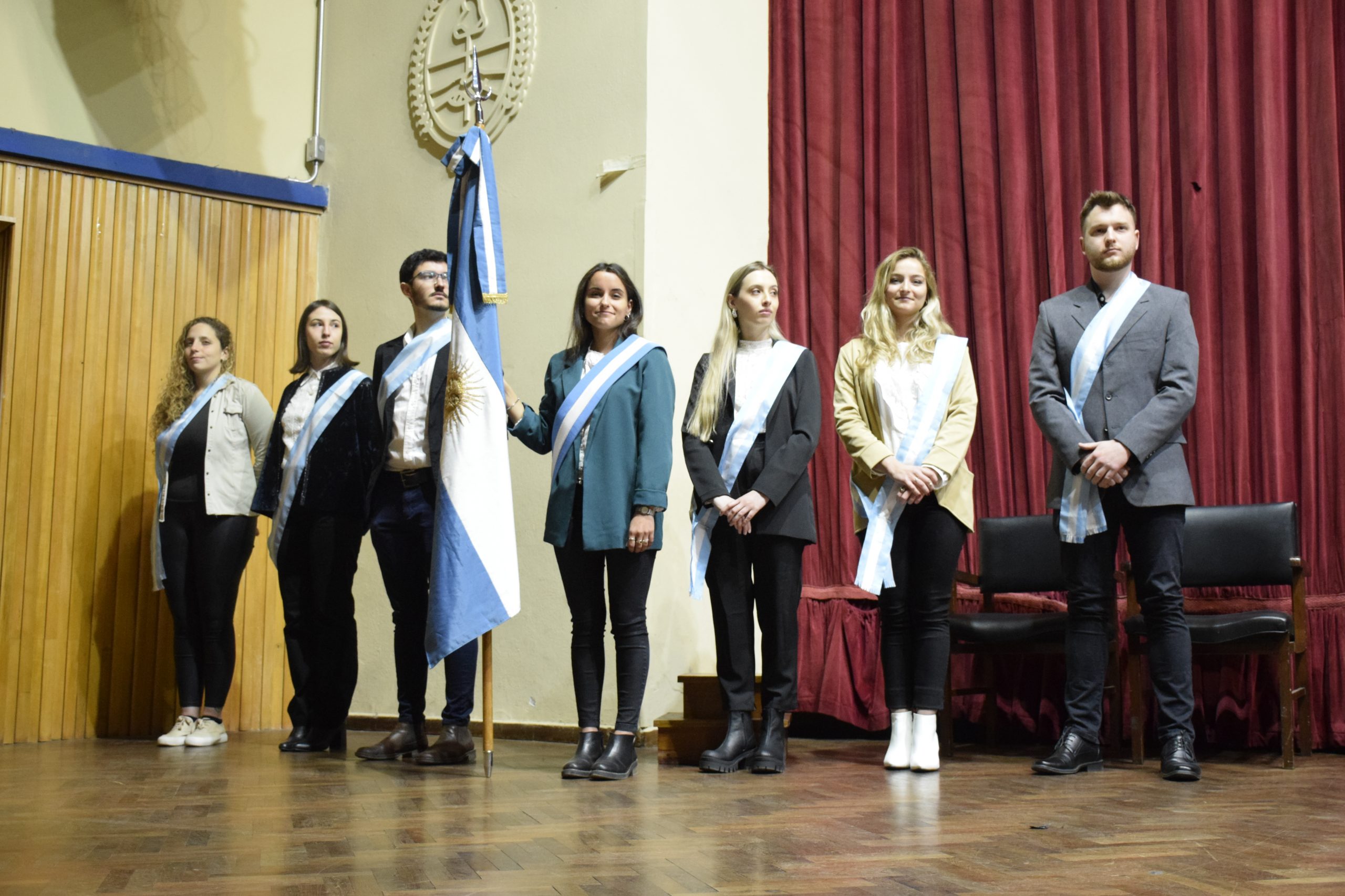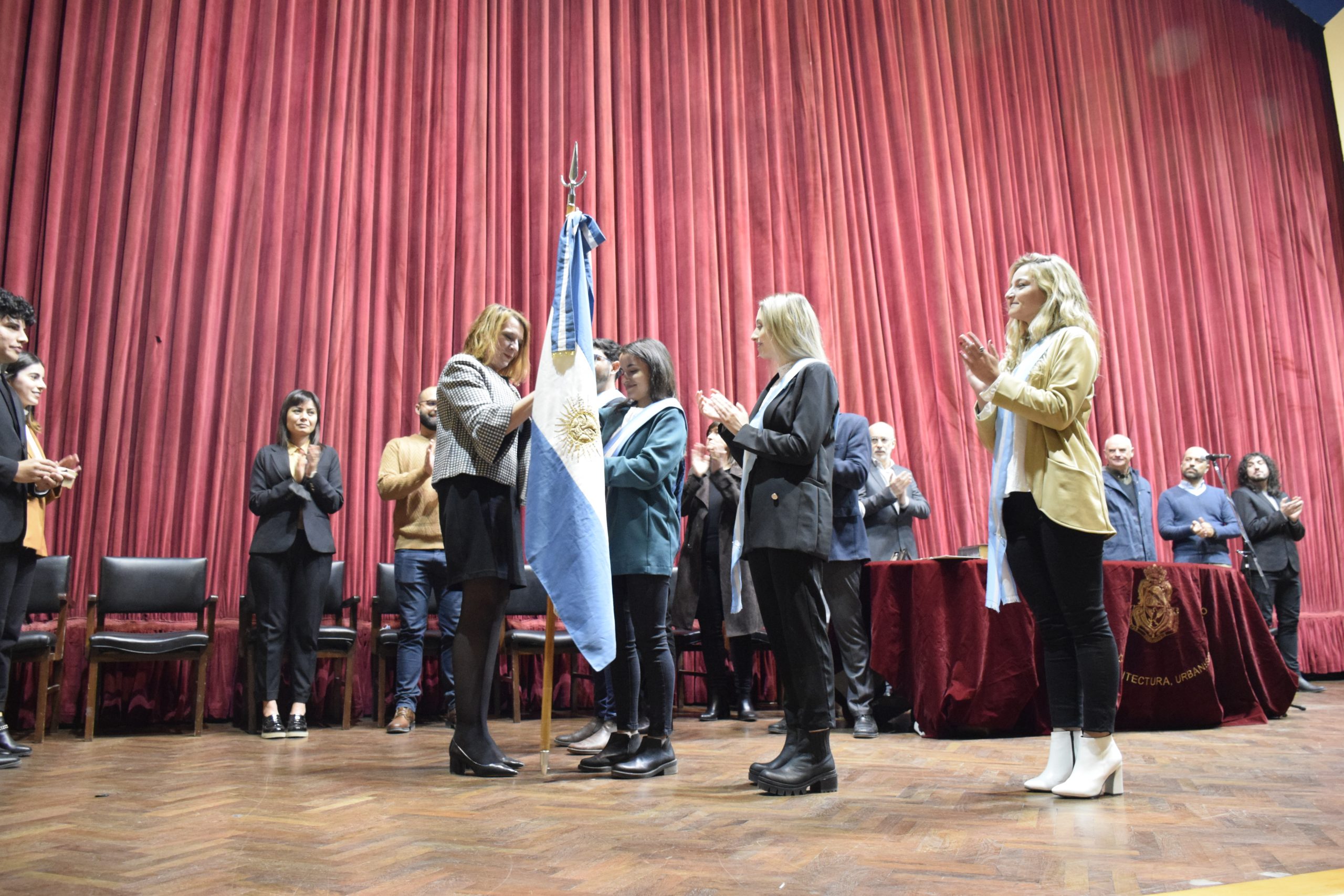 ▪ En el acto se realizó el cambio de bandera de la FAUD. El cuadro de honor saliente conformado por el abanderado Hernán Eduardo Ellena, el primer escolta Joel Andrés Gudiño Mercado, suplente María Naila Julián; segunda escolta Valentina Astini y Delfina Palandri Bocco como suplente; renovó sus insignias y quedó integrado por: Valentina Astini como abanderada; Lucas Thomas Becher como primer escolta y Paula Giaveno como suplente; Gimena Ciriaci Ribone en segunda escolta y Constanza Ficetto Ghiano como suplente. También conforman el cuadro de honor de la FAUD los estudiantes Luciana Dutari y Gerardo Adrián Mayer, de la carrera Diseño Industrial, por su destacado desempeño académico.