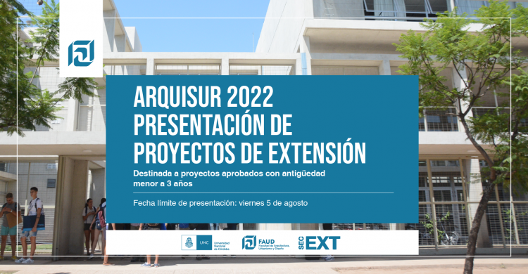 Secretaría de Extensión informa que se encuentra abierta la convocatoria para la presentación de proyectos de extensión para el Congreso Arquisur 2022, hasta el día viernes 5 de agosto del 2022,