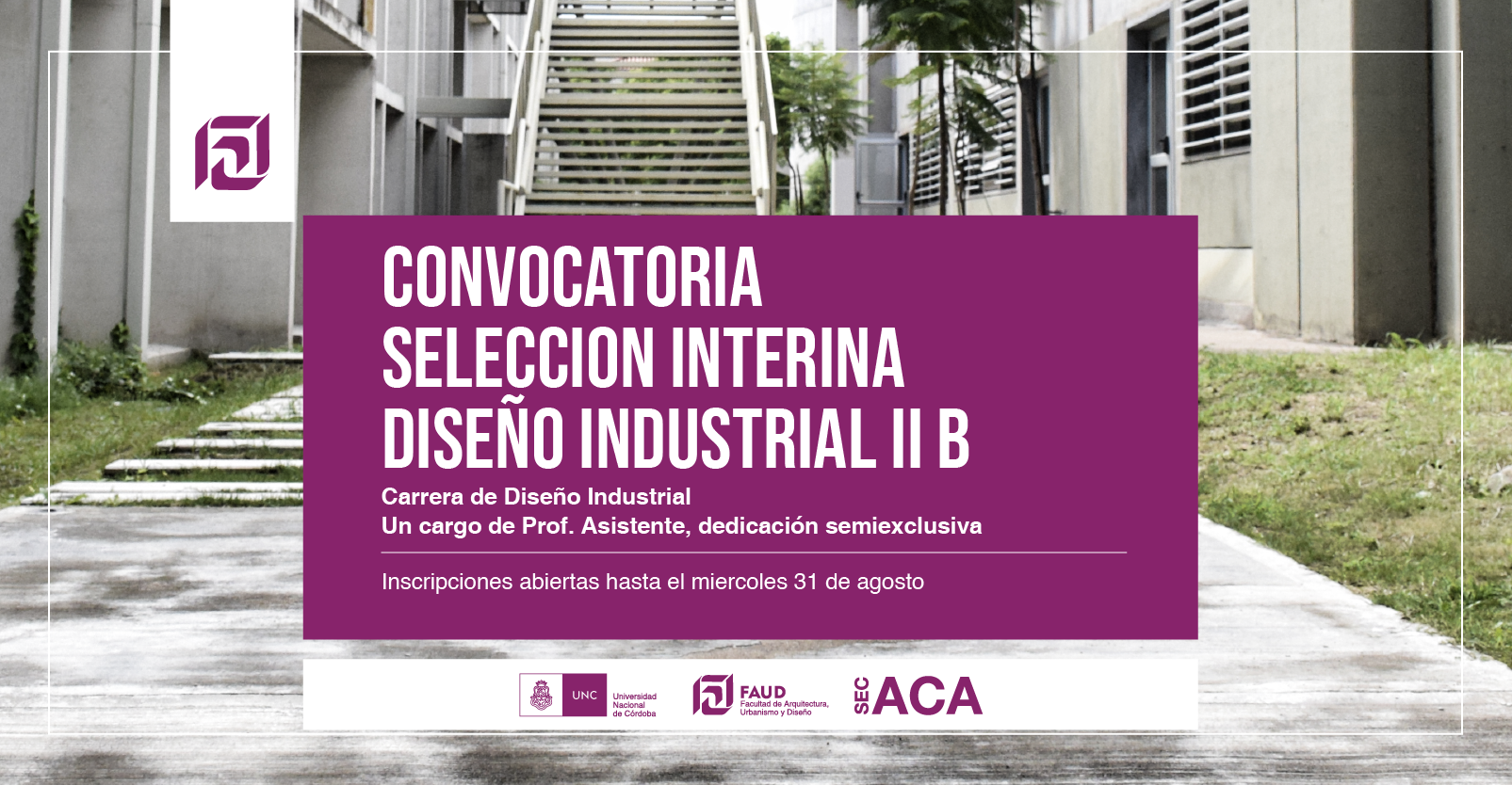 Secretaría Académica informa que se encuentra abierto el llamado a selección interina para el cargo de Prof. Asistente dedicación semiexclusiva, para la cátedra de Diseño Industrial II B.