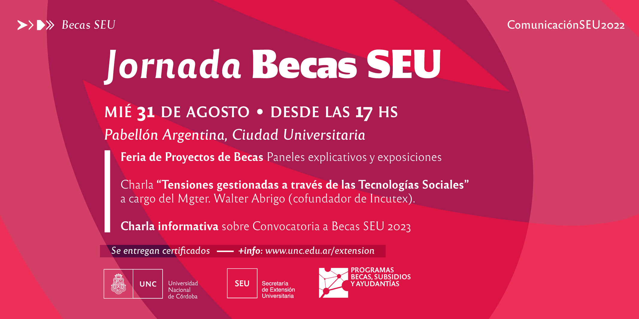 En esta jornada, se desarrollarán diferentes actividades organizadas por el Programa de Ayudantías, Becas y Subsidios de Extensión (PABSE) de Extensión UNC con el objetivo de estas actividades es de presentar el trabajo, compromiso y contribución realizada a la sociedad por los proyectos de Becas SEU, y promover la presentación de nuevas propuestas en el marco de la convocatoria 2023.