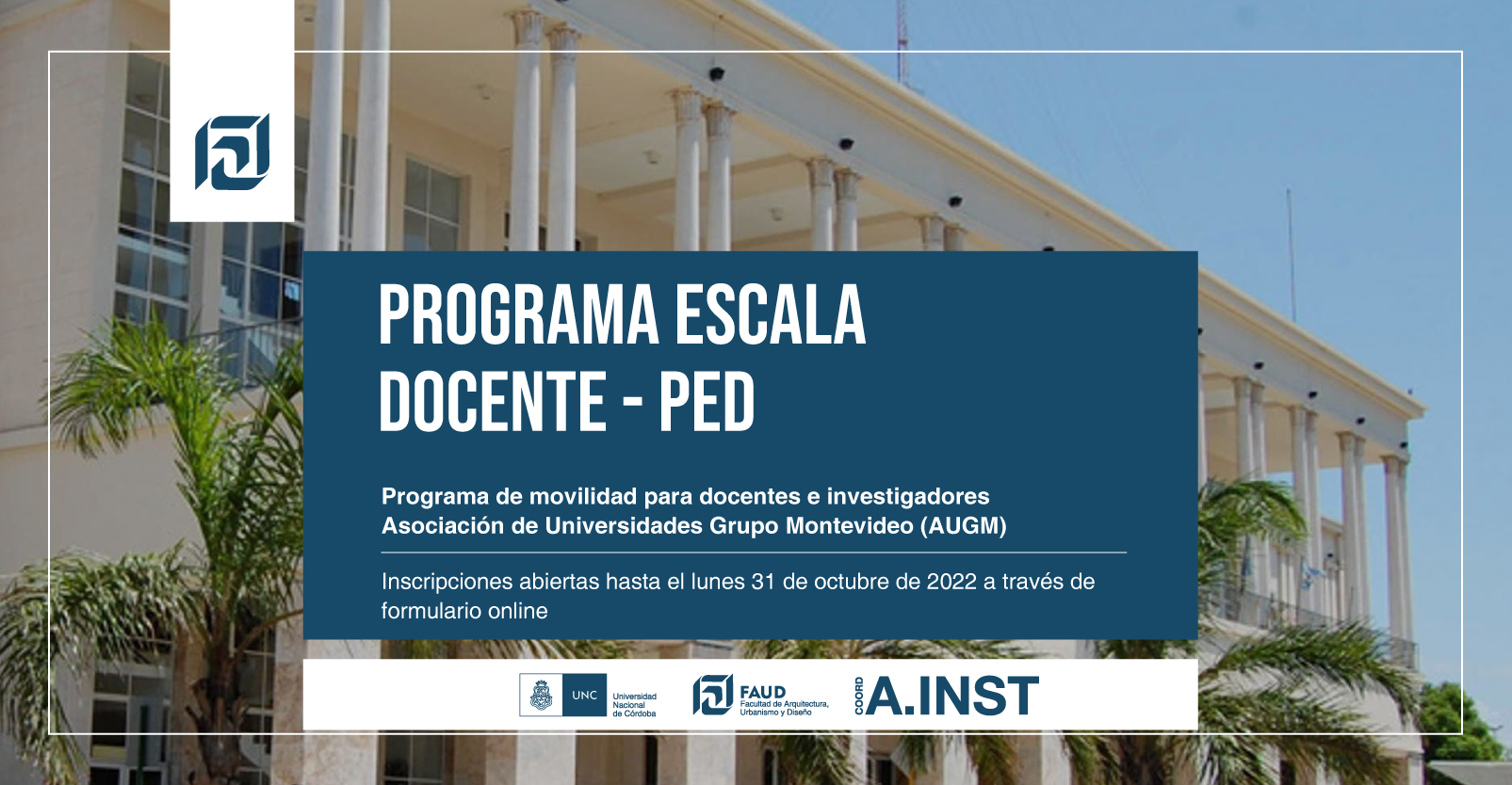La Coordinación de Asuntos Institucionales informa que se encuentra abierta la convocatoria del Programa ESCALA Docente - PED, destinada a docentes e investigadores de la FAUD.