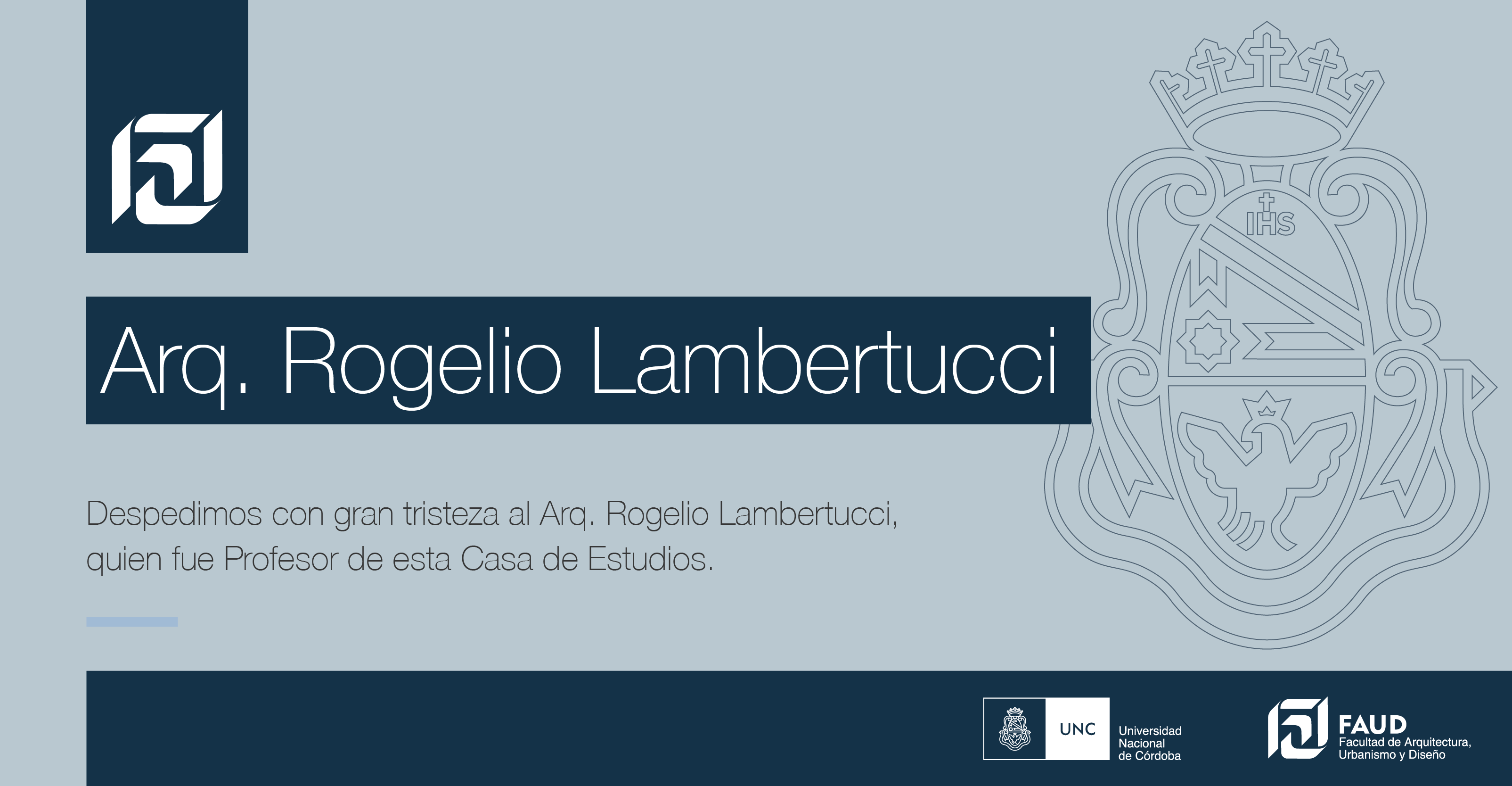 La Facultad de Arquitectura, Urbanismo y Diseño de la UNC comunica con profundo pesar el fallecimiento del Arq. Rogelio Lambertucci, quien fue Profesor Titular de nuestra Casa de Estudios.