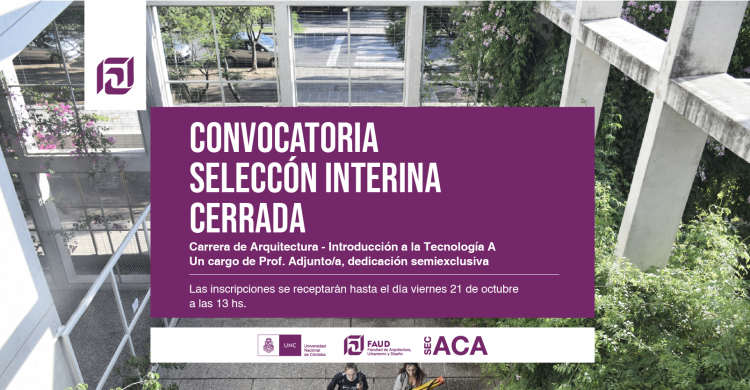 Secretaría Académica informa que se encuentra disponible el llamado a selección interina cerrada para el cargo de Prof. Adjunto/a dedicación semiexclusiva, para la cátedra Introducción a la Tecnología A.