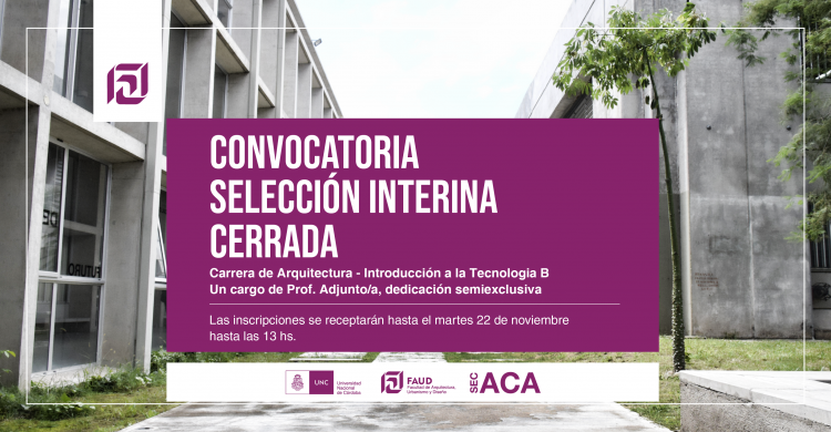 Secretaría Académica informa que se encuentra disponible el llamado a selección interina cerrada para el cargo de Prof. Adjunto/a dedicación semiexclusiva, para la cátedra de Introducción a la Tecnología B.