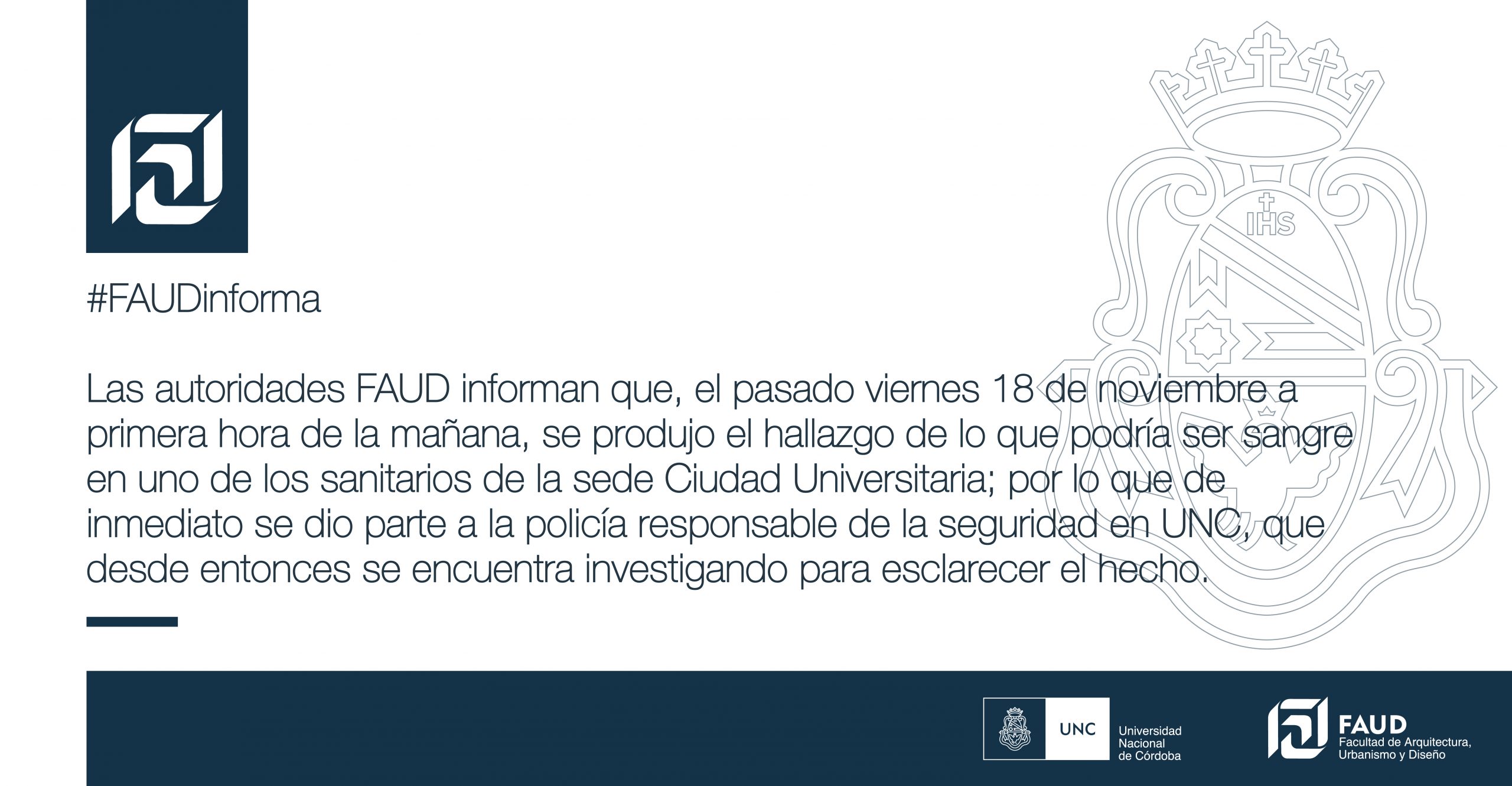 Las autoridades FAUD informan que, el pasado viernes 18 de noviembre a primera hora de la mañana, se produjo el hallazgo de lo que podría ser sangre en uno de los sanitarios de la sede Ciudad Universitaria; por lo que de inmediato se dio parte a la policía responsable de la seguridad en UNC, que desde entonces se encuentra investigando para esclarecer el hecho.