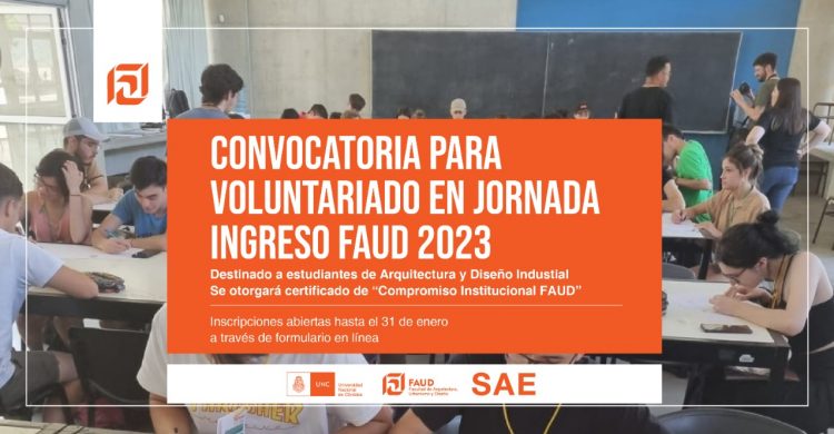 La Secretaría de Asuntos Estudiantiles informa que se encuentra abierta la convocatoria para participar del voluntariado en la Jornada de Ingreso FAUD 2023, en el marco del programa “Compromiso Institucional FAUD”.