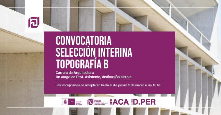 Secretaría Académica y la Coordinación de Desarrollo del Personal informan que se encuentra disponible el llamado a selección interina abierta para el cargo de Prof. Asistente dedicación simple, para la cátedra Topografía B.
