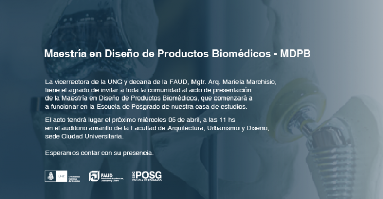 La vicerrectora de la UNC y decana de la FAUD, Mgtr. Arq. Mariela Marchisio, tiene el agrado de invitar a toda la comunidad al acto de presentación de la Maestría en Diseño de Productos Biomédicos, una oferta de excelencia que no tiene antecedentes de posgrado en la región ni en el país.