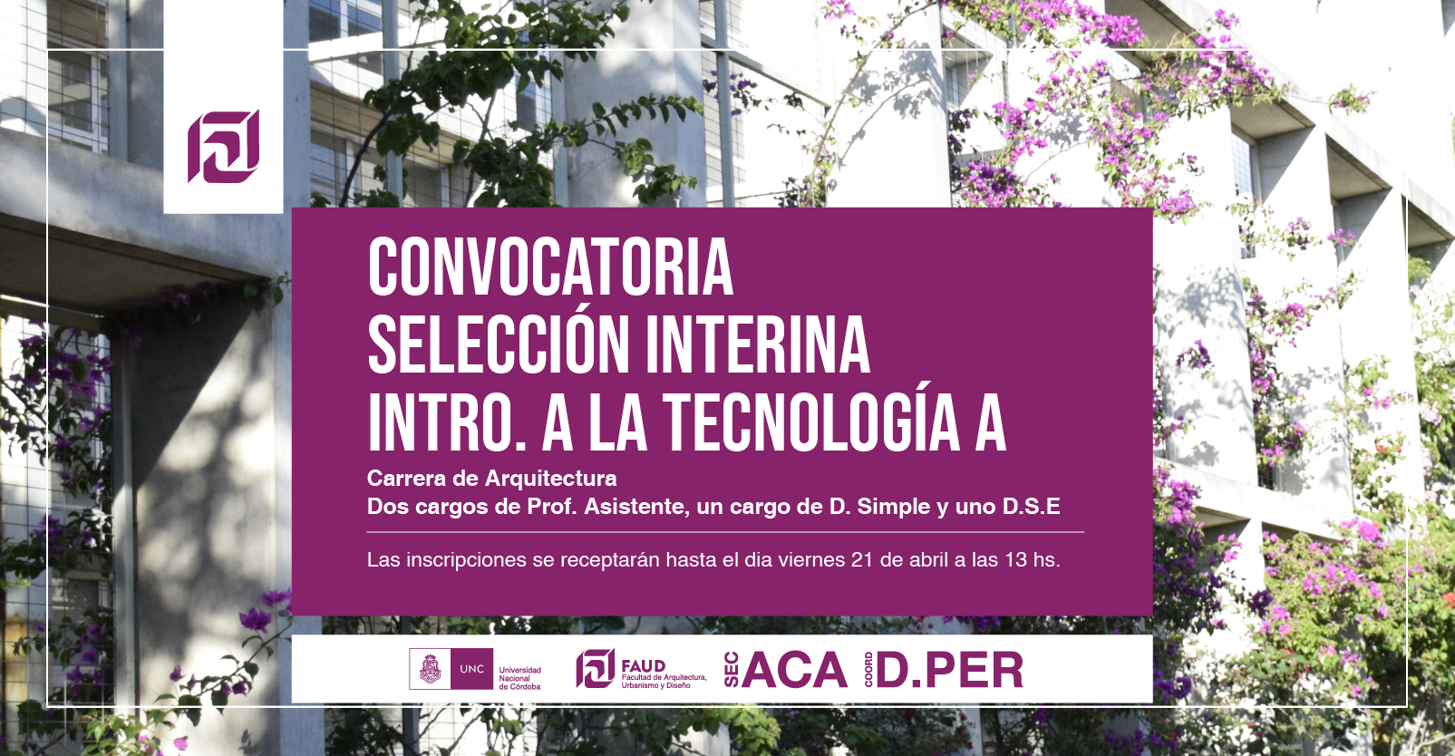 Secretaría Académica y la Coordinación de Desarrollo del Personal informan que se encuentra disponible el llamado a selección interina abierta para cubrir dos cargos de Prof. Asistente; uno de dedicación semiexclusiva, y el otro de dedicación simple, para la cátedra Introducción a la Tecnología A de la carrera de Arquitectura.