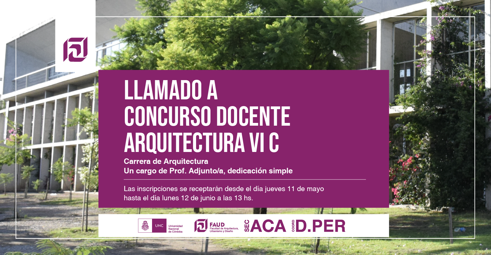 Secretaría Académica y Coordinación de Desarrollo del Personal informan que se encuentra disponible el llamado a concurso docente para la cátedra Arquitectura VI C de la carrera de Arquitectura.
