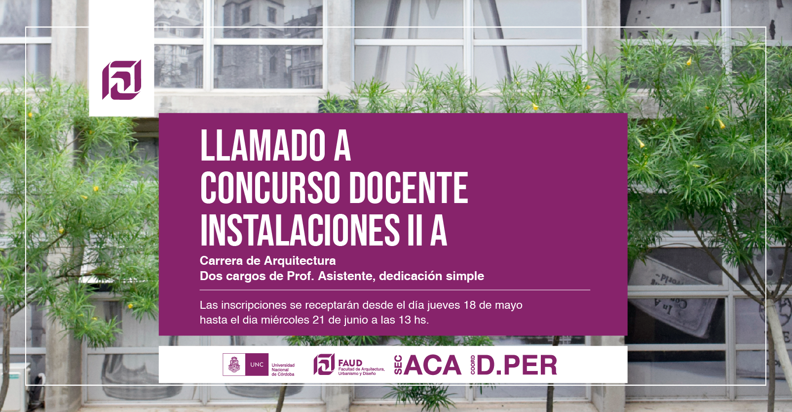Secretaría Académica y Coordinación de Desarrollo del Personal informan que se encuentra disponible el llamado a concurso docente para la cátedra Instalaciones II A de la carrera de Arquitectura.