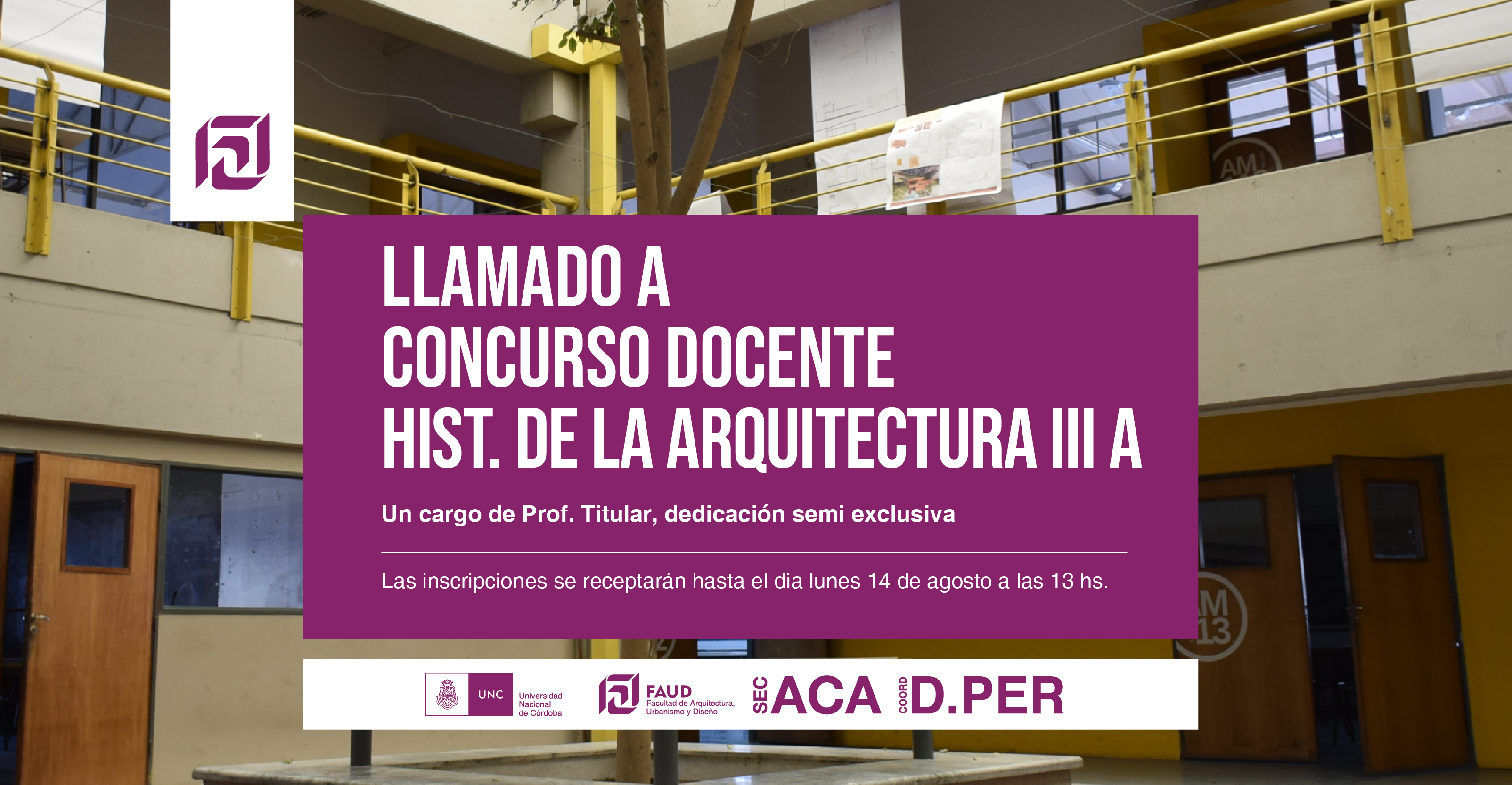Secretaría Académica y la Coordinación de Desarrollo del Personal informan el llamado a concurso docente para la cátedra Historia de la Arquitectura III A, de la carrera de Arquitectura.
