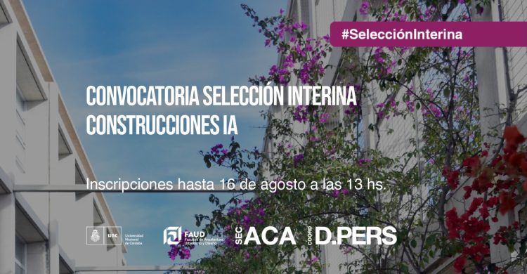 Secretaría Académica y la Coordinación de Desarrollo del Personal informan que se encuentra disponible el llamado a selección interina abierta para cubrir un cargo de Prof. Asistente, dedicación simple (suplencia transitoria por 3 meses), para la cátedra de Construcciones I A de la carrera de Aquitectura.