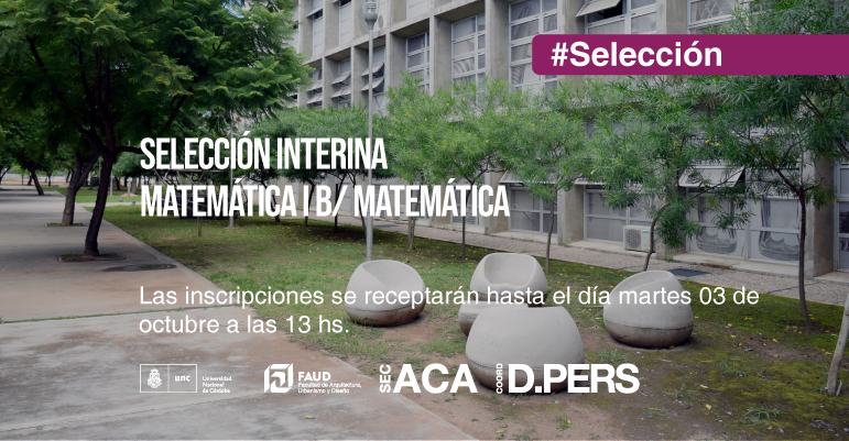 Secretaría Académica y la Coordinación de Desarrollo del Personal informan que se encuentra disponible el llamado a selección interina cerrada para cubrir un cargo de Prof. Adjunto/a dedicación semiexclusiva, para la cátedra de Matemática de la carrera de Diseño Industrial - Matemática I B, suplencia transitoria, carrera de Arquitectura.