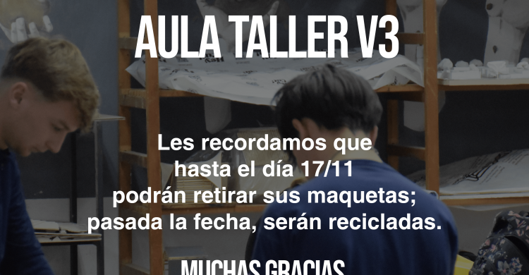 Recordamos que hasta el día 17 de noviembre podrán retirarse las maquetas que se encuentran en el Taller de Maquetería V3, módulo verde.