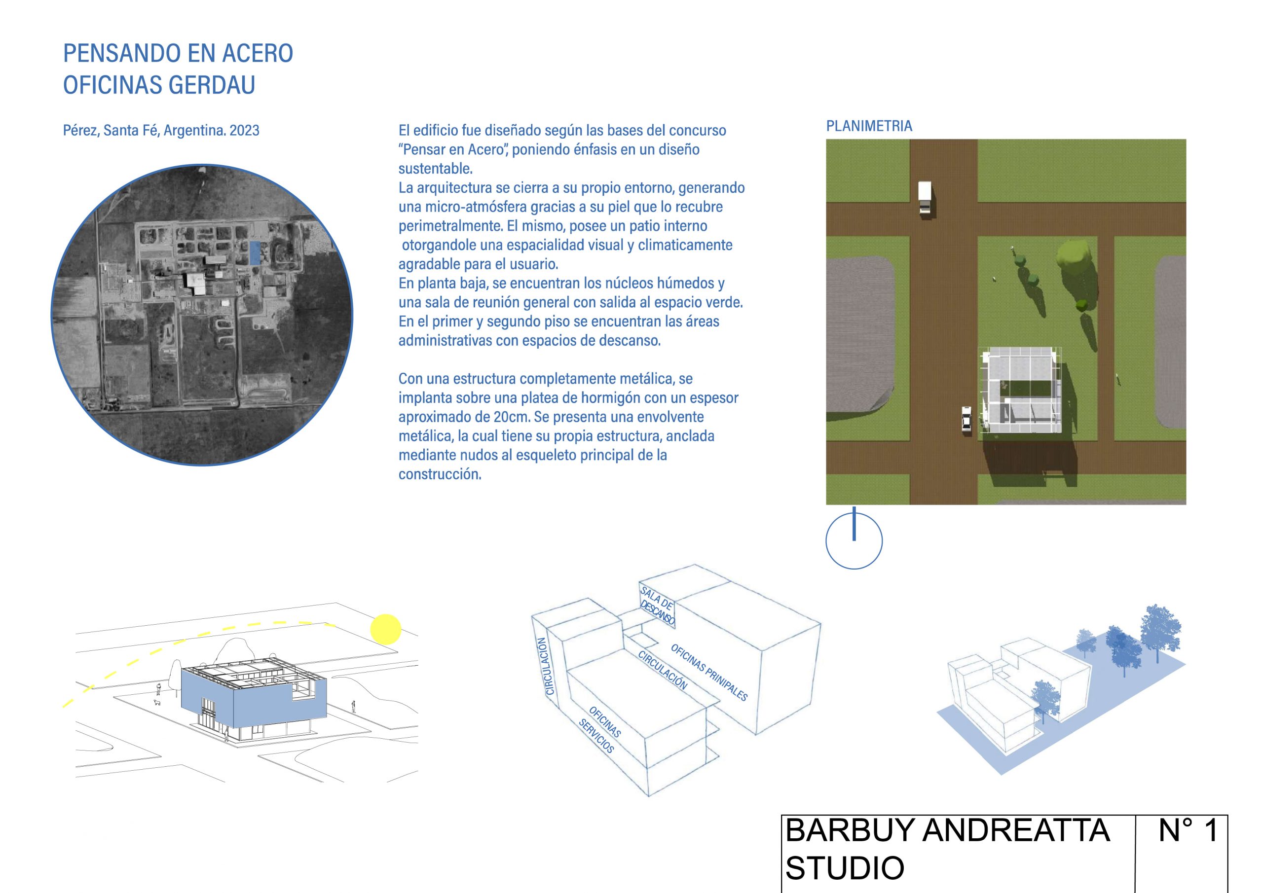 La Secretaría de Extensión comunica el fallo del jurado del concurso PENSANDO EN ACERO - 6° Edición - Anteproyectos para las nuevas oficinas del área de metálicos de la Acería Gerdau, en la ciudad de Pérez, provincia de Santa Fe.