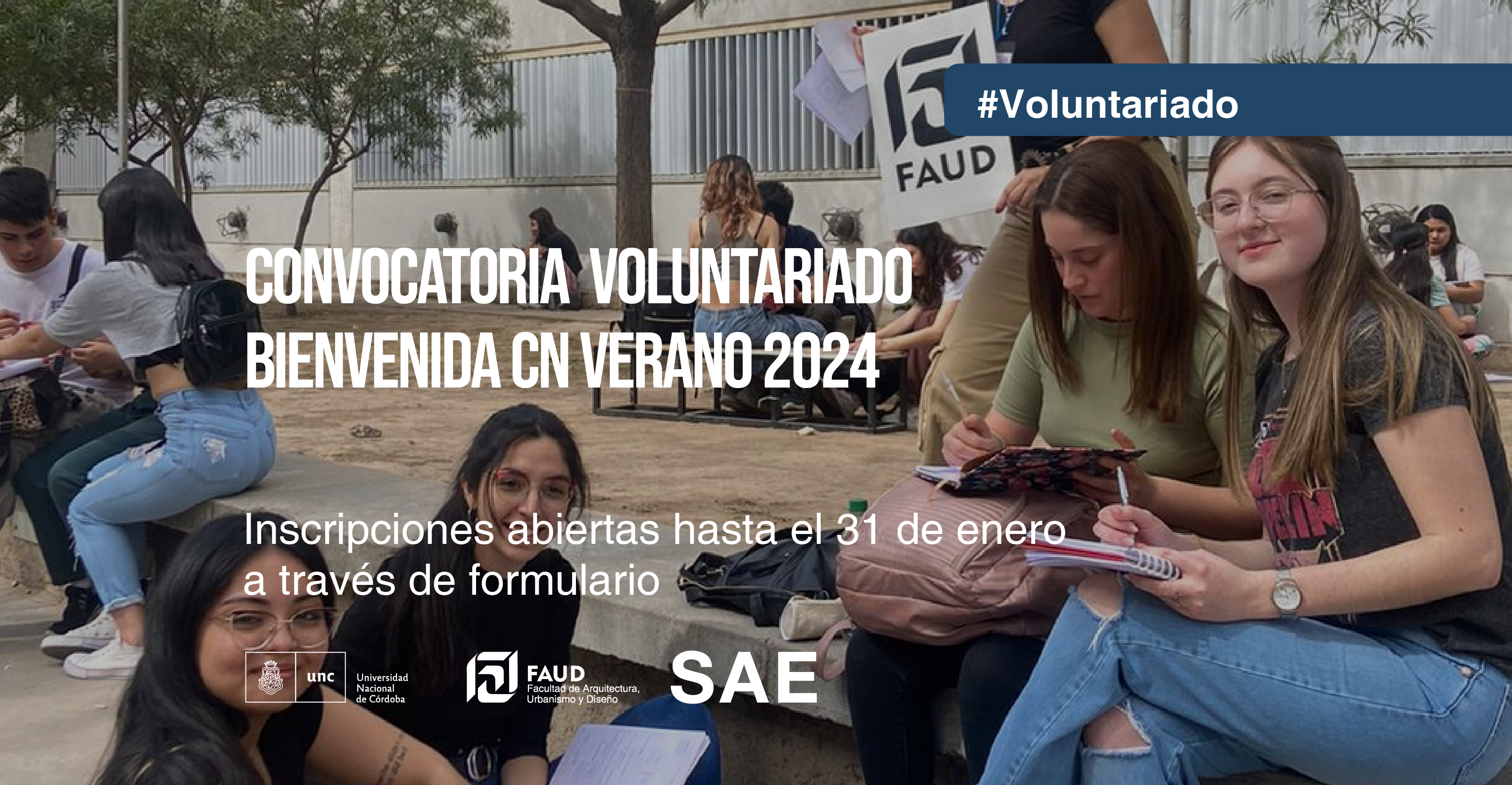 La Secretaría de Asuntos Estudiantiles invita a estudiantes de Arquitectura, Diseño Industrial y Diseño del Paisaje a colaborar como voluntarios y voluntarias en el Acto de Bienvenida y apertura del Ciclo de Nivelación CN 2024 - Edición Verano