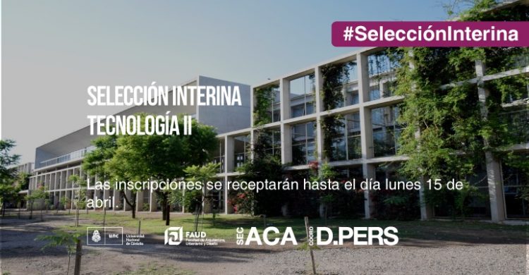 Secretaría Académica y la Coordinación de Desarrollo del Personal informan que se encuentra disponible la convocatoria a selección interina abierta para cubrir un cargo de Prof. Asistente D. Simple para la cátedra de TECNOLOGÍA II de la carrera de Diseño Industrial.