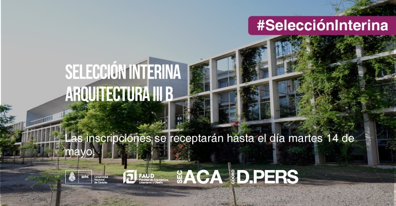 Secretaría Académica y la Coordinación de Desarrollo del Personal informan que se encuentra disponible la convocatoria a selección interina abierta para cubrir un cargo de Prof. Asistente D. Semiexclusiva para la cátedra de ARQUITECTURA III B .