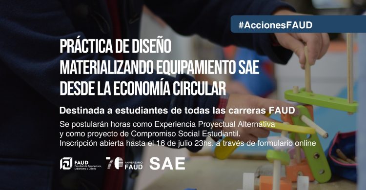 La Secretaría de Asuntos Estudiantiles de la Facultad de Arquitectura, Urbanismo y Diseño, invita a la comunidad de estudiantes regulares de nuestras carreras de grado a participar de la PRÁCTICA DE DISEÑO “Materializando equipamiento de Concurso SAE desde la economía circular”.