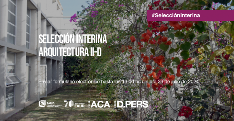 Secretaría Académica y la Coordinación de Desarrollo del Personal informan que se encuentra disponible la convocatoria a selección interina para cubrir un cargo de Prof. Asistente D. Semiexclusiva para la cátedra de ARQUITECTURA II – D.
