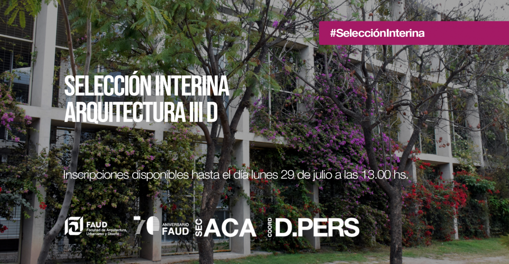 Secretaría Académica y la Coordinación de Desarrollo del Personal informan que se encuentra disponible la convocatoria a selección interina para cubrir un cargo de Prof. Asistente D. Semiexclusiva para la cátedra de ARQUITECTURA III – D (suplencia transitoria – 3 meses).