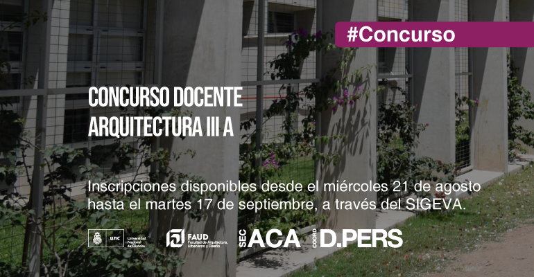 Secretaría Académica y la Coordinación de Desarrollo del Personal informan que se encuentra disponible la inscripción para cubrir un cargo de Profesor/a Adjunto/a DSE en la cátedra de ARQUITECTURA III – A, carrera arquitectura.