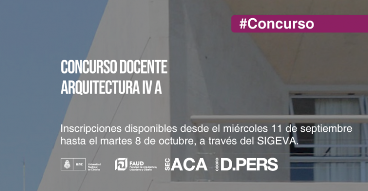 Secretaría Académica y la Coordinación de Desarrollo del Personal informan que se encuentra disponible la inscripción para cubrir un cargo de Profesor/a Asistente DSE en la cátedra de ARQUITECTURA IV A, carrera arquitectura.