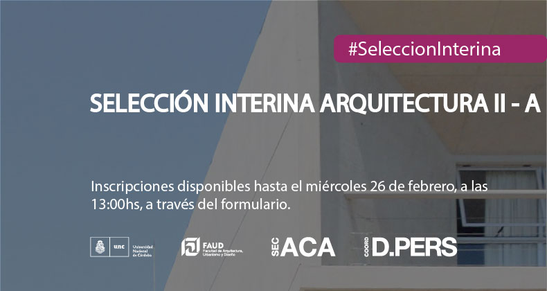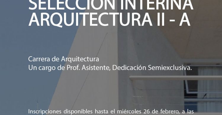 Secretaría Académica y la Coordinación de Desarrollo del Personal informan la apertura a inscripciones para cubrir un cargo de PROFESOR/A ASISTENTE D.Semiexclusiva para la cátedra de ARQUITECTURA II-A. Las inscripciones se receptarán a través del siguiente FORMULARIO al que deberá adjuntarse el Curriculum Vitae resumido (máximo 6 carillas), hasta las 13.00 hs. del día 26 de febrero de 2025.