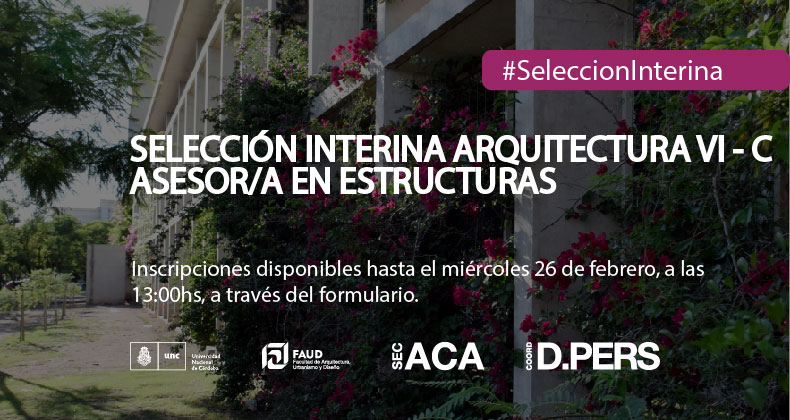 Secretaría Académica y la Coordinación de Desarrollo del Personal informan la apertura a inscripciones para cubrir un cargo de PROFESOR/A ADJUNTO/A D.Simple para la cátedra de ARQUITECTURA VI-C – ASESOR/A EN ESTRUCTURAS. Las inscripciones se receptarán a través del siguiente FORMULARIO al que deberá adjuntarse el Curriculum Vitae resumido (máximo 6 carillas), hasta las 13.00 hs. del día 26 de febrero de 2025.