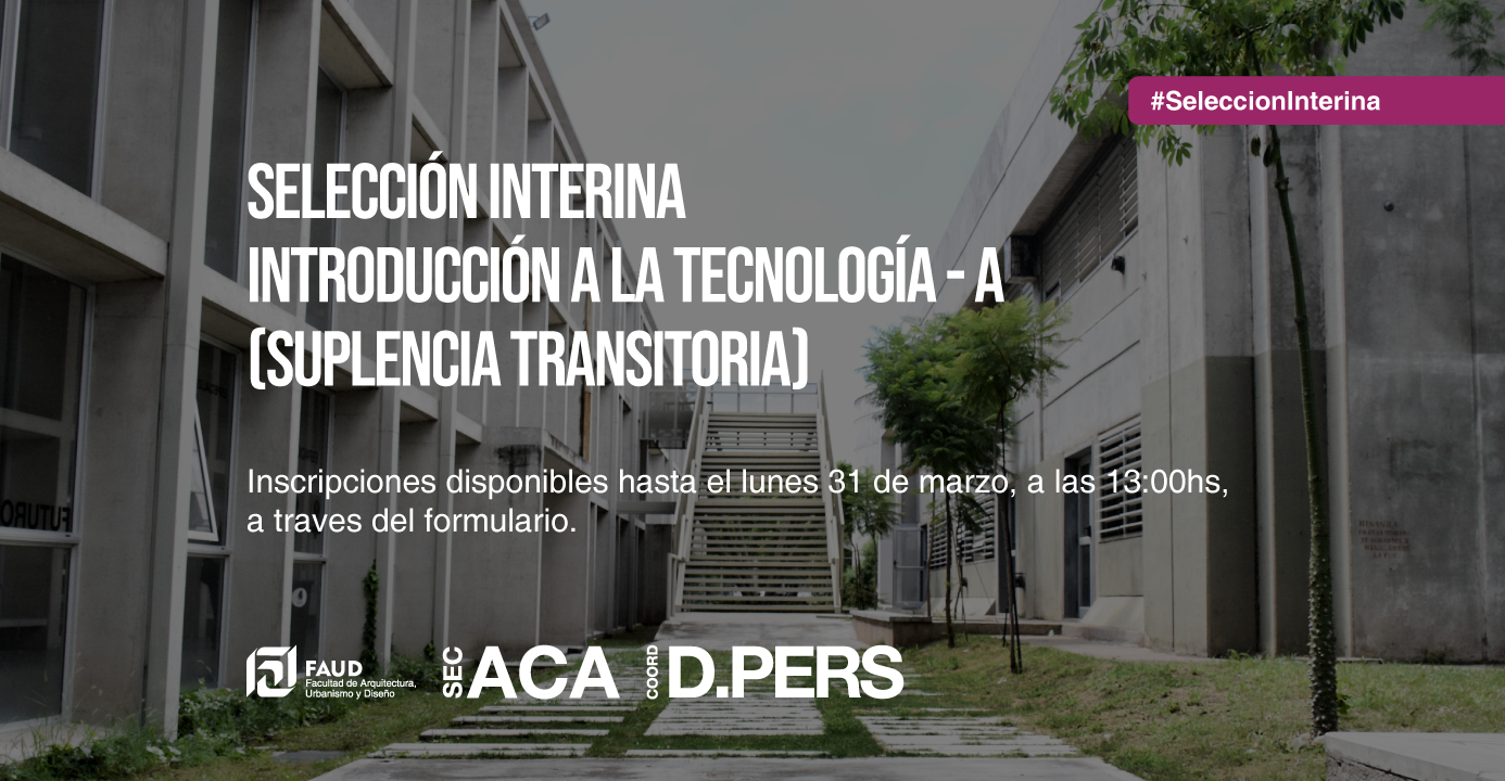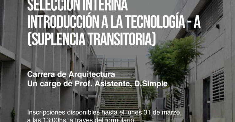 Secretaría Académica y la Coordinación de Desarrollo del Personal informan que se encuentra abierta la convocatoria para la selección interina de un cargo de PROFESOR/A ASISTENTE D.Simple para la cátedra de INTRODUCCION A LA TECNOLOGÍA-A de la carrera de Arquitectura (suplencia transitoria).