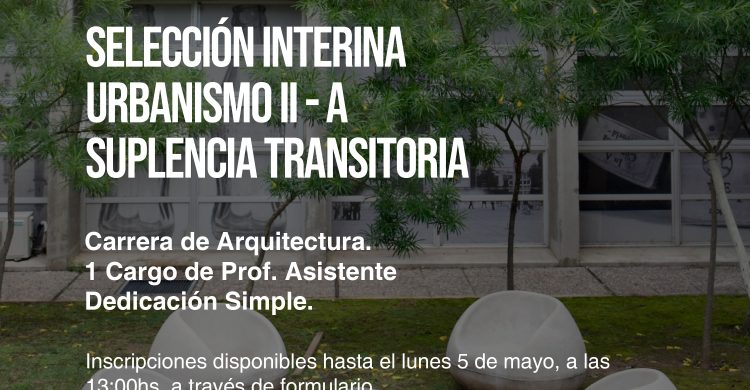 La Secretaría Académica y la Coordinación de Desarrollo del Personal informan que se encuentra abierta la convocatoria para la selección interina de un cargo de PROFESOR/A ASISTENTE D.Simple para la cátedra de URBANISMO II-A. (Suplencia transitoria).