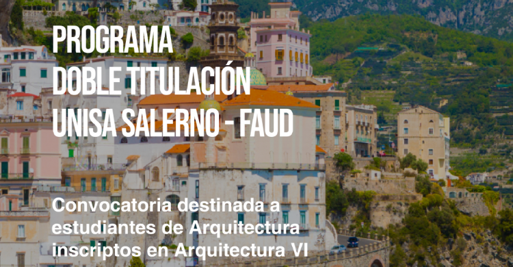 La Coordinación de Asuntos Institucionales de la FAUD informa que se encuentra abierta la convocatoria para postular al Programa de Doble Titulación con la Universidad de Salerno, Italia, dirigido a estudiantes que estén inscriptos a trabajo final de la carrera de Arquitectura.