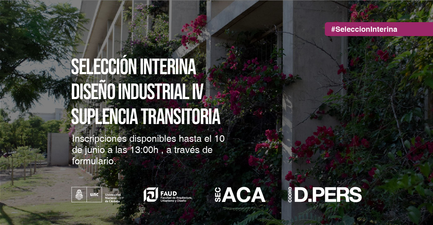 Un cargo de PROFESOR/A AYUDANTE A – Dedicación Simple para la cátedra de DISEÑO INDUSTRIAL IV (Suplencia Transitoria). Las inscripciones se receptarán a través del siguiente FORMULARIO al que deberá adjuntarse el  Curriculum Vitae  resumido (máximo 6 carillas), hasta las 13.00 hs. del día 10 de junio de 2025.