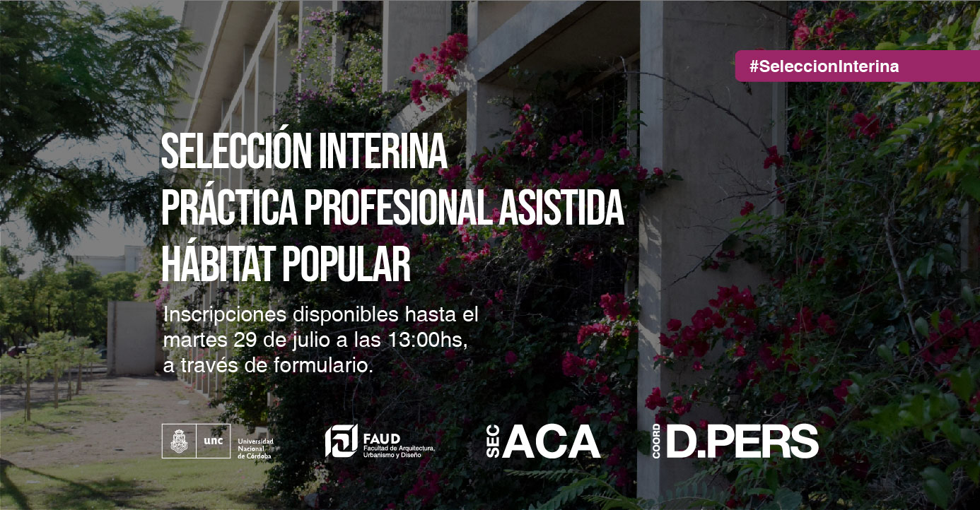 La Secretaría Académica y la Coordinación de Desarrollo del Personal informan que se encuentra abierta la convocatoria para la selección interina de un cargo de PROFESOR/A ASISTENTE D. Simple para la cátedra de PRÁCTICA PROFESIONAL ASISTIDA (HÁBITAT POPULAR).